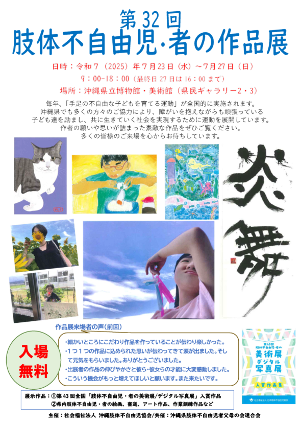 沖縄県でも多くの方々のご協力により、障がいを抱えながらも頑張っている子ども達を励まし、共に生きていく社会を実現するために運動を展開しています。今年も、「第32回 肢体不自由児・者の作品展」を沖縄県立博物館・美術館(県民ギャラリー)にて開催します。作者の願いや思いが詰まった素敵な作品をぜひご覧ください。多くの皆様のご来場を心からお待ちしています!