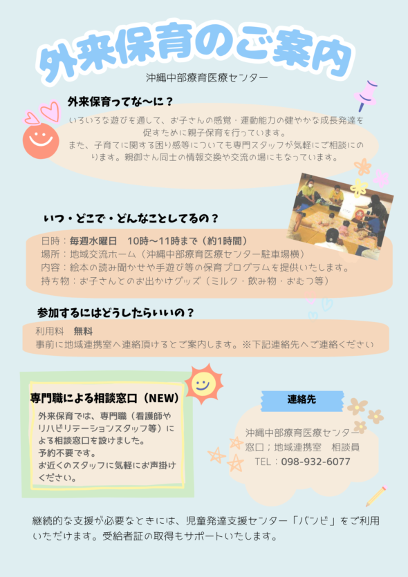沖縄中部療育医療センターでは、毎週水曜日に「外来保育」を行っています。